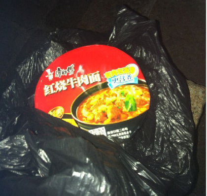 偷卖的商店从里面拿出泡面,黑色的袋子装着泡面,售价15元